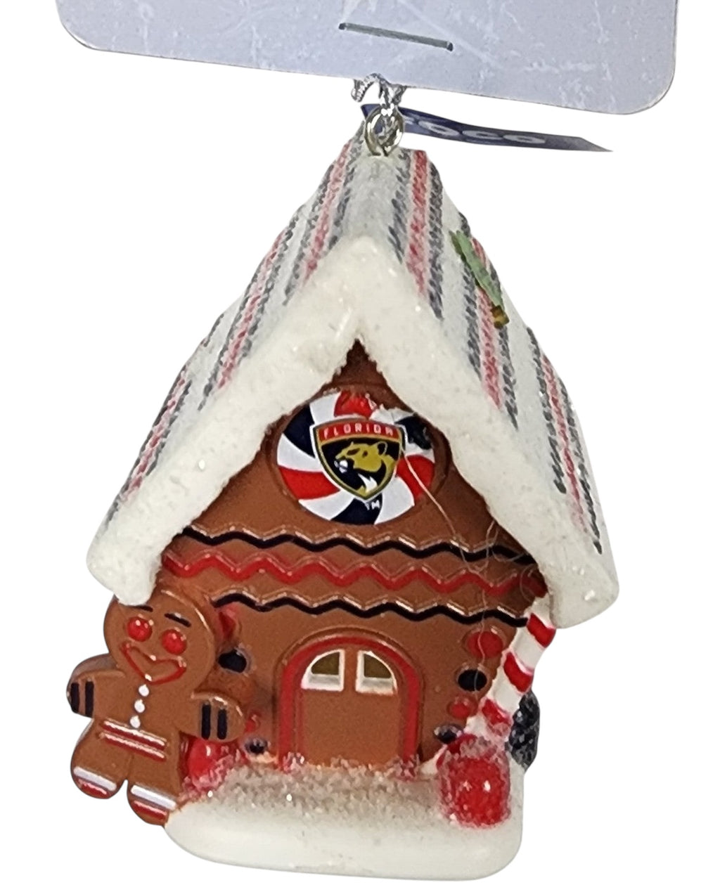 - Gingerbread man standing in front of gingerbread house with team-colored accents