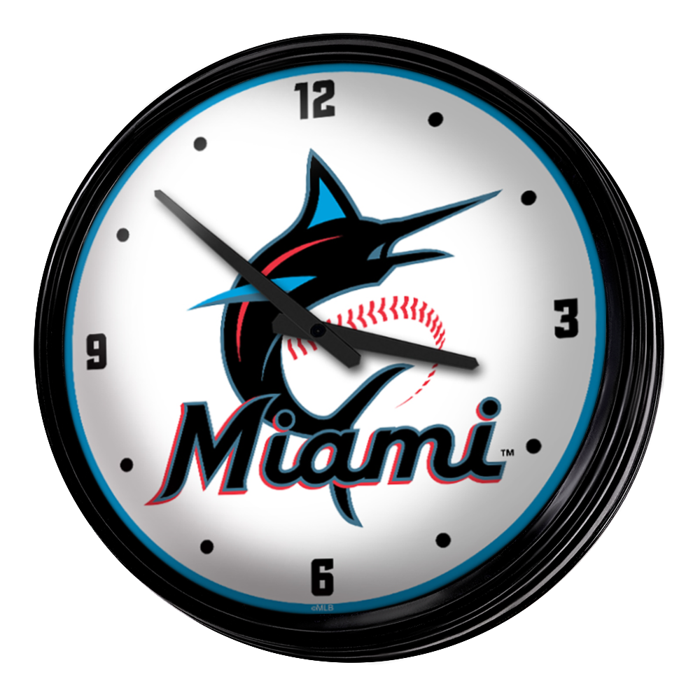 This premium Miami Marlins Retro Lighted Wall Clock will be sure to add the finishing touch to any room of the home or office. This piece is injection molded and features a high-resolution, high gloss digitally printed face. Comes with an 8-foot power cord and an on/off pull switch for the light. LED illuminated. Hanging hardware and light bulb included. This is an officially licensed product of the Marlins and made in the USA.